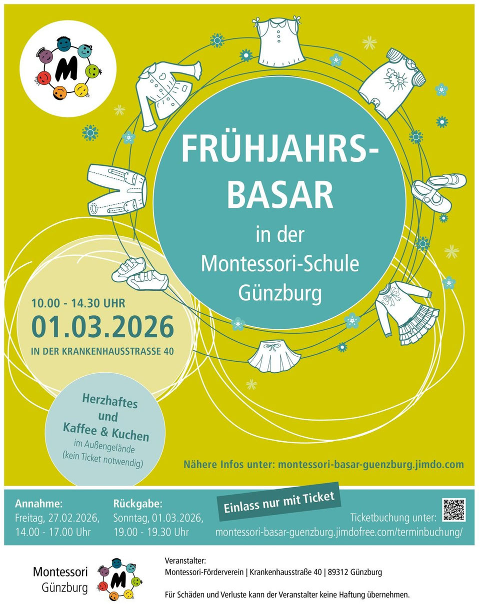 Der Montessori Förderverein Günzburg veranstaltet am Sonntag, den 01.03.26 in der Montessori Schule Günzburg, Krankenhausstr. 40 einen Frühjahrs-Basar von 10.00 – 14.30 Uhr.