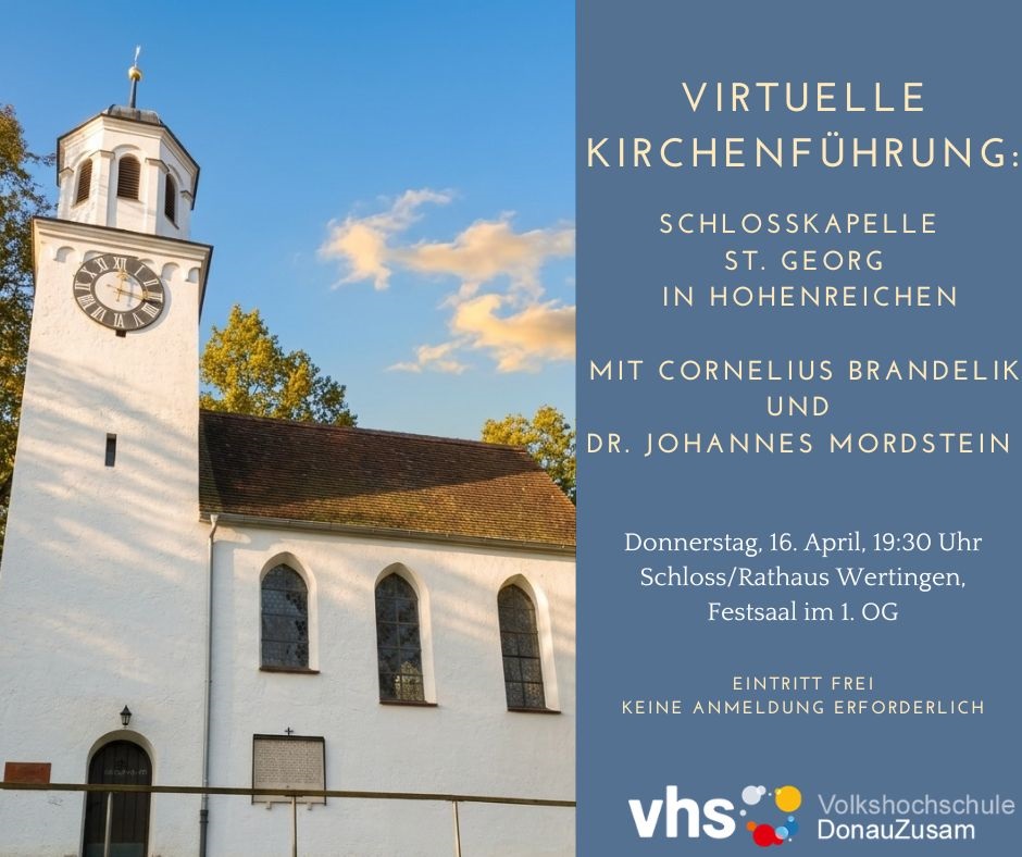 Etwas versteckt auf dem Schlossberg Hohenreichen gelegen, zählt die Schlosskapelle St. Georg zu den wichtigsten kulturhistorischen Schätzen der Wertinger Gegend. Aber keine Sorge, für unsere besondere Führung müssen Sie keine Stufen steigen oder den Schlossberg erklimmen. Zwei versierte Kenner der Wertinger Regionalgeschichte, Museumsreferent Cornelius Brandelik und Stadtarchivar Dr. Johannes Mordstein, nehmen Sie mit au einen virtuellen Streifzug durch die Anlage. Insbesondere der Flügelaltar mit der Darstellung des Ritterheiligen Georg von 1515 ist ein wahrer Kunstschatz von überregionaler Bedeutung. Aber auch die übrige Ausstattung kommt nicht zu kurz und wird im Rahmen des Vortrags erläutert.