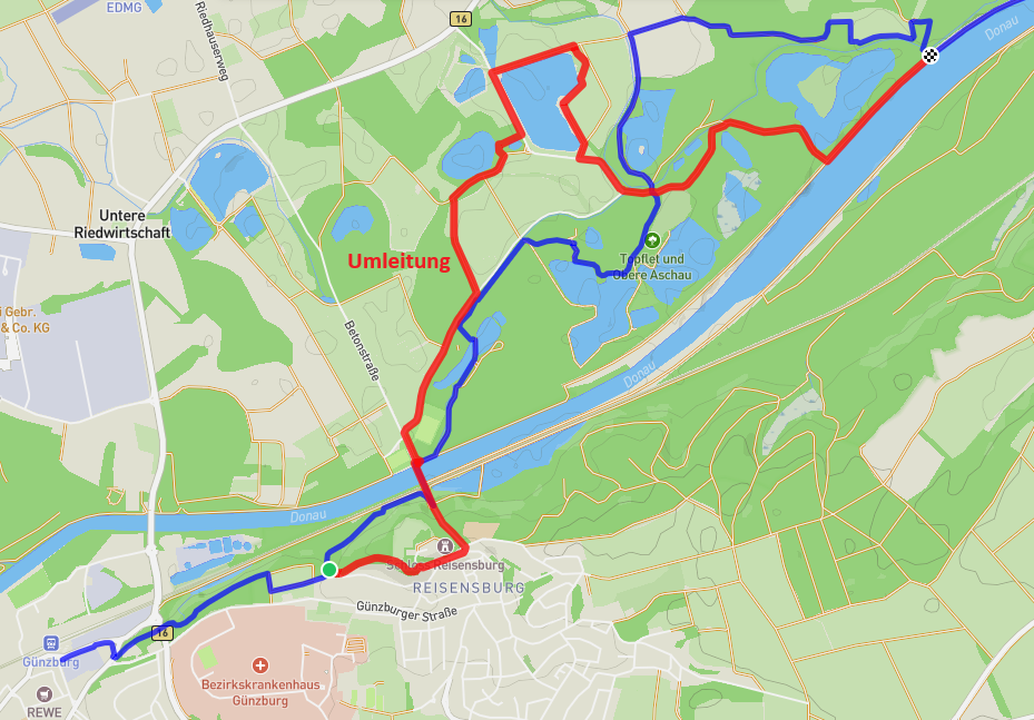 Aufgrund morscher/kranker Bäume (Eschentriebsterben) besteht beim Passieren des DonAUwalds im Bereich Günzburg derzeit Lebensgefahr. Ein Abschnitt der Etappe 1 zwischen Günzburg und Offingen ist daher bis auf Weiteres gesperrt. Eine Umleitung ist vor Ort eingerichtet.